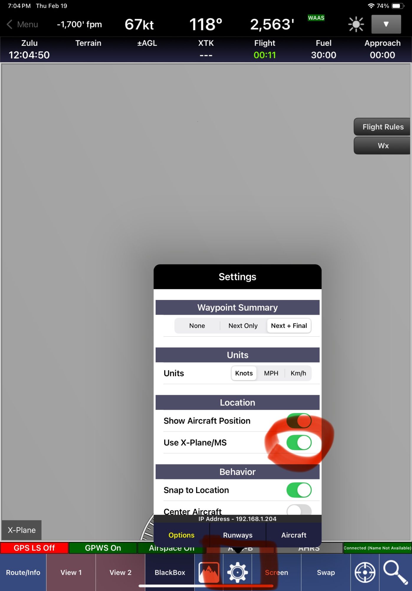 – If your FS2EFB app installed on different device than XCSoar, IP address should match local IP of the device with app installed (you can find it at the top of the black screen