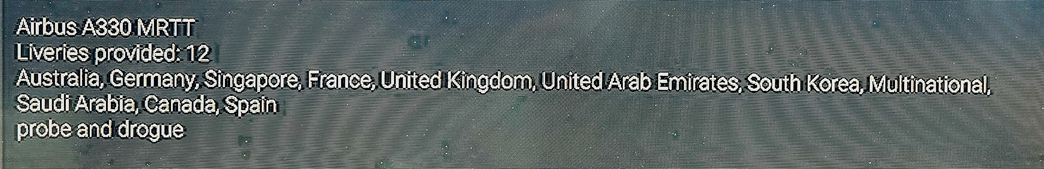 It’s Azurpoly’s Jaguar A. In-flight refueling worked perfectly with this aircraft. I made a mistake and since then, I can’t get the drogue, the software only suggests the Boom. I should point out that I don’t have this problem with Azurpoly’s Jaguar GR1. It seems that the backup of the Jaguar A’s AAR parameters has been corrupted, but I haven’t found a way of resetting it.